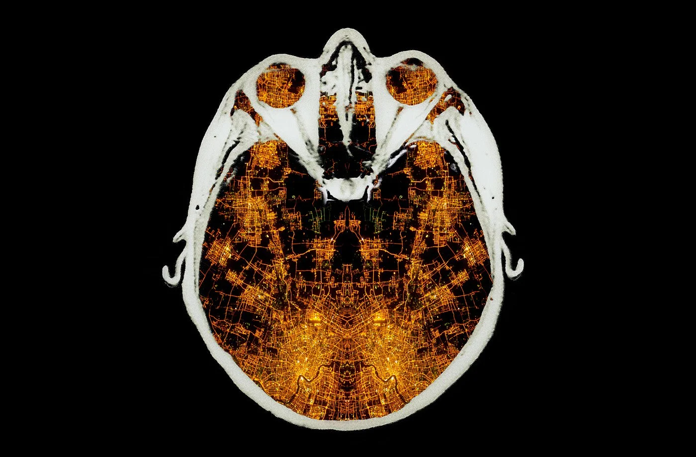 By recombining medical imaging—MRI, CT, X-ray—with satellite imagery, the work reveals a shared visual language across vastly different scales. These landscapes feel simultaneously intimate and planetary, personal and impersonal, inviting reflection on where the self begins and ends.
